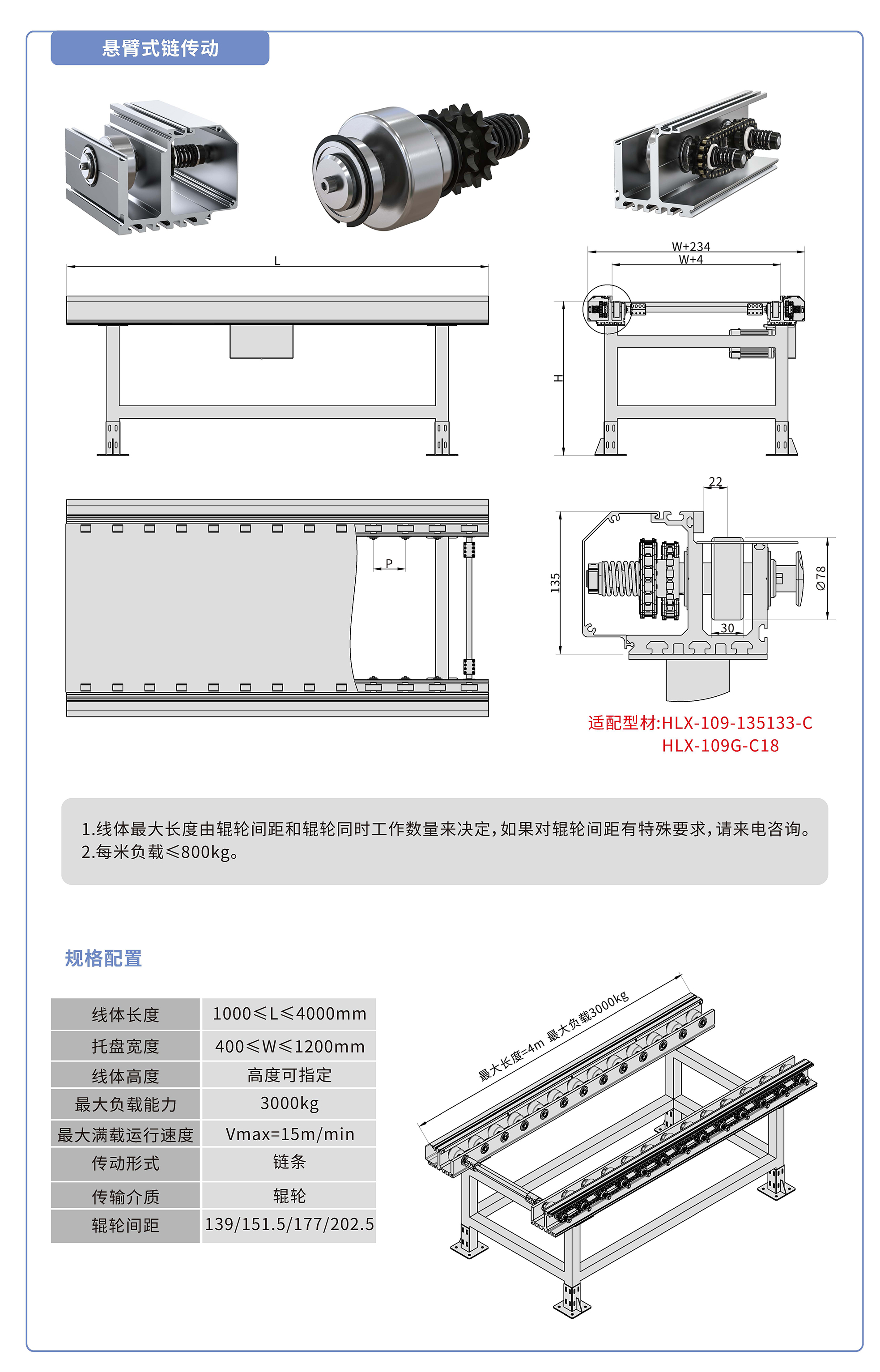 采用135133鋁型材,鏈輪傳動(dòng),鍍鉻滾輪鑲嵌銅套實(shí)現(xiàn)積放功能,負(fù)載3000kg/米,最大負(fù)載速度15M/min, 輪距139、151.5、177、202.5可選,適用托盤寬度400-1200mm,線體長度范圍1000-4000mm, 高度根據(jù)需求定制.