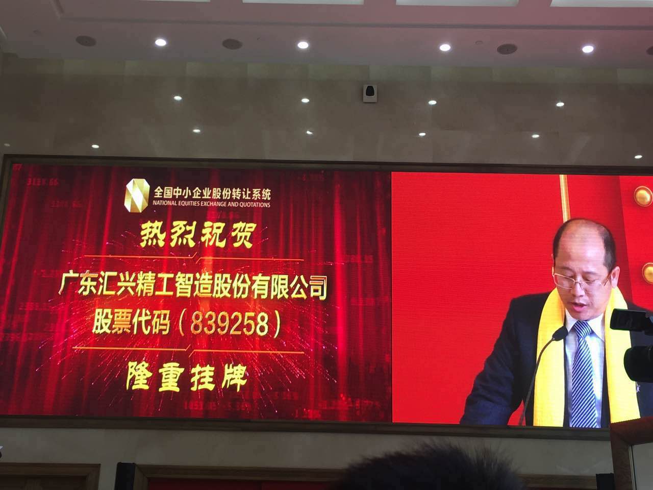 鐘輝董事長為成功掛牌事宜代表發(fā)言 從2015年,匯興智造啟動(dòng)進(jìn)軍資本市場(chǎng)的戰(zhàn)略,在東莞證券股份有限公司、大信會(huì)計(jì)師事務(wù)所(特殊普通合伙)、廣東莞泰律師事務(wù)所等合作伙伴、各級(jí)政府、社會(huì)各界的幫助下,開始“新三板”掛牌籌備工作,并于2016年5月完成了股份制改造直至今日(2016年11月1日上午10點(diǎn))在全國中小企業(yè)股份轉(zhuǎn)讓系統(tǒng)儀式大廳成功掛牌上市。