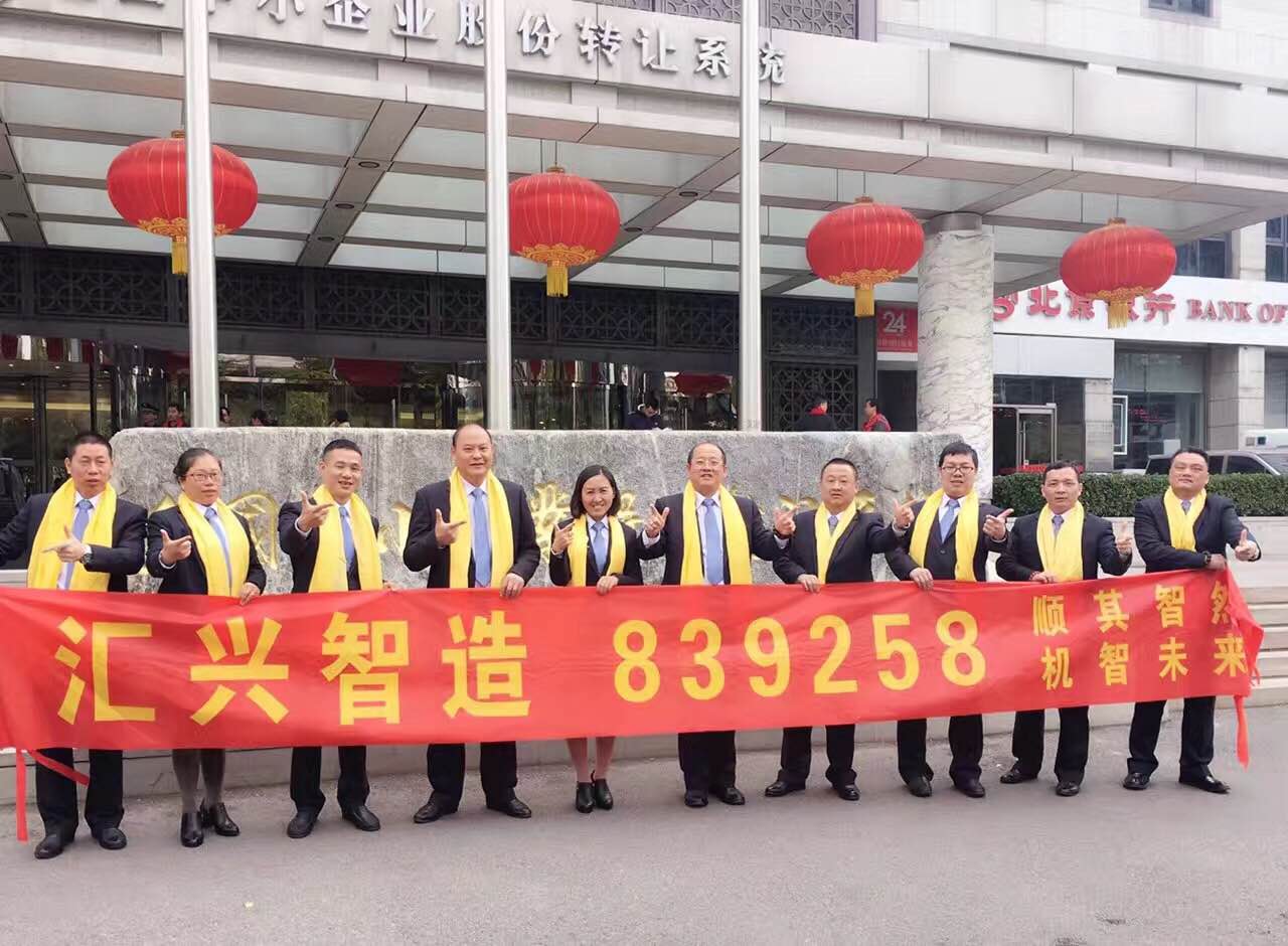 2016年11月1日上午10點(diǎn),廣東匯興精工智造股份有限公司(股票代碼:839258)以下簡稱匯興智造,在全國中小企業(yè)股份轉(zhuǎn)讓系統(tǒng)儀式大廳隆重舉行掛牌上市儀式。參加此次掛牌事宜內(nèi)部嘉賓主要代表有鐘輝董事長、昆山公司鐘世鑫總經(jīng)理、重慶公司胡偉路總經(jīng)理、李福生總經(jīng)理、呂常垣總經(jīng)理、鄧高全總監(jiān)等董監(jiān)高10余人。由鐘輝董事長代表發(fā)言及敲鐘儀式。成為了中國資本市場(chǎng)上首家以“精工智造股份有限公司”名稱掛牌上市的企業(yè)。