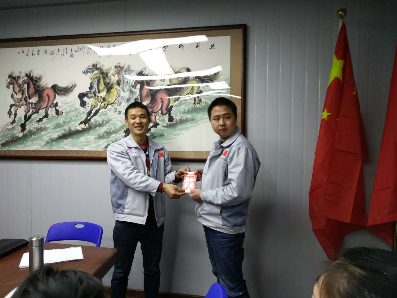 大會進行到尾聲,對每月度之星的選舉。胡總(圖左)為月度之星徐財華戰(zhàn)士(圖右)頒發(fā)獎金。同時感謝他對于公司的無私奉獻,對于同事的無微關(guān)懷,并擁護匯利興這個大家庭;同時匯利興還有很多人都在默默地奉獻與努力(例如:成都辦事處的張國桃經(jīng)理,在今年6月17日與戰(zhàn)車傳奇進軍成都開疆擴土、奮戰(zhàn)近一年),在此感謝他無私的奉獻。匯興智造有著你們這群人的努力與付出,相信我們會更加靠近我們的夢,實現(xiàn)中國智能裝備全產(chǎn)業(yè)鏈集成智造標桿,繼續(xù)引領(lǐng)行業(yè)的發(fā)展。