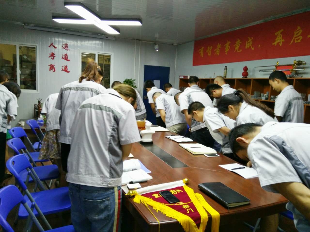 2017年8月1日晚,我司全體人員在匯興學(xué)校召開七月月度大會,依次由自我價值稱估稱及簽到入場。大會召開前,全體人員對企業(yè)三道(人道、孝道、商道)行三鞠躬,隨后進(jìn)入會議主題。
