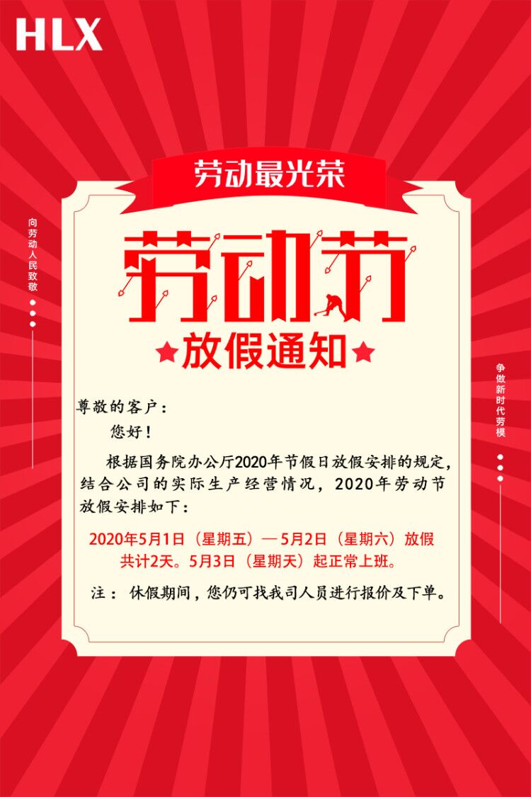 尊敬的客戶: 您好! 根據(jù)國務(wù)院辦公廳2020年節(jié)假日放假安排的規(guī)定,結(jié)合公司的實際生產(chǎn)經(jīng)營情況,2020年勞動節(jié)放假安排如下: