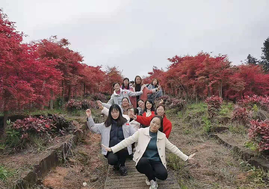 春風(fēng)得意馬蹄疾,一日看盡萬里楓。品嘗農(nóng)家特色菜肴后,全員整裝移步紅楓林,漫步紅楓葉區(qū),與山水自然融為一體,放松心情,享受大自然溫暖,大家愜意的走在楓林小道上,環(huán)望四周楓葉搖曳處充滿著春天的氣息,遠望近觀密密扎扎的樹枝上呈火焰紅,把滿山裝扮的紅彤彤的,極盡壯觀;在春陽照耀下,微風(fēng)輕拂,楓葉左右搖曳,姹紫嫣紅,惹人陶醉,十分美麗,宛若進入了一個童話世界里,讓大家瞬間感覺自己像是在仙氣飄渺的世外桃源中,一掃平時工作的壓力,十分放松;大家三五成群,談笑風(fēng)生,一路上聊著鬧著,畫面其樂融融,拍照留影,感受著春天的紅楓秋色。