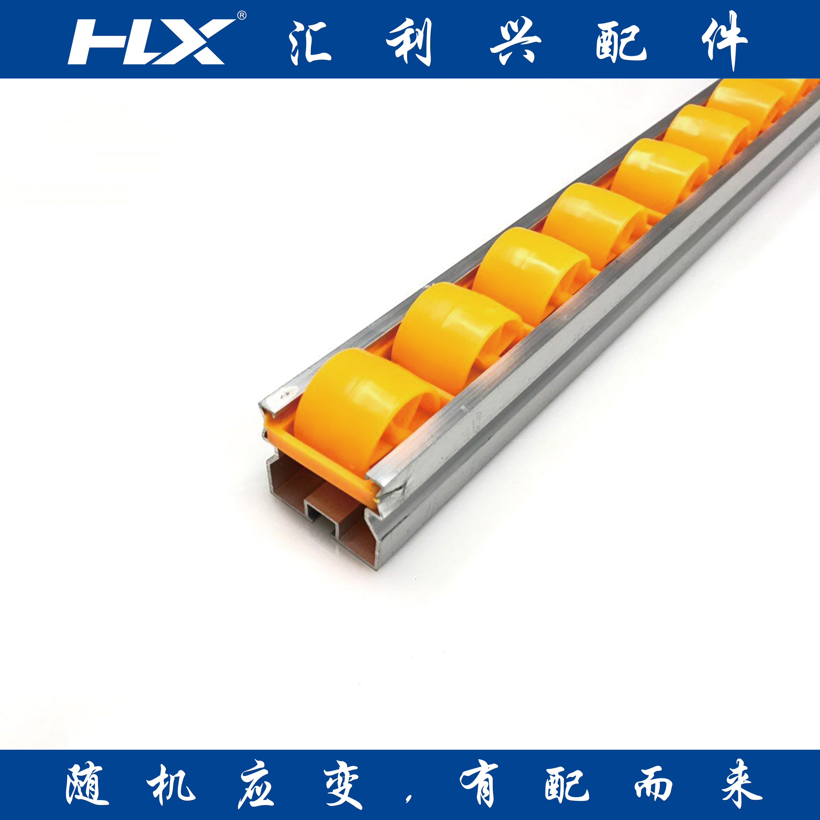 匯利興產(chǎn)品這流水線配件流利條系列,流利條主要用于輸送、倉儲(chǔ)系統(tǒng)配套產(chǎn)品,可用作滑軌、護(hù)欄、導(dǎo)向裝置、滾動(dòng)性能好、成本低。滾輪采用高品質(zhì)的熱塑性塑料制成,具有摩擦系數(shù)小、抗沖擊、壽命長(zhǎng)、耐酸堿性、耐潮溫等優(yōu)點(diǎn)。當(dāng)貨物重量超過額定的負(fù)荷時(shí),可在一個(gè)通道安裝多根流利條。安裝傾斜度取決于重量以及流利架的深度,一般3O~6O(5%~9%)。通常在深度方向上每隔600mm~800mm安裝一根支撐梁以增強(qiáng)流利條的剛度。滾輪顏色可選:黃色,藍(lán)色,白色,黑色等其他顏色。輪距常用為:35mm,45mm  并可以根據(jù)實(shí)際使用情況定尺生產(chǎn)。我司專業(yè)生產(chǎn)鋁全金流利條,載重流利條,板金流利條,鋁全金流利條接頭,板金流利條接頭等流水線配件。